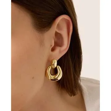 Show more Introducing these stunning 14K yellow gold-plated door knocker earrings that effortlessly blend modern elegance with a vintage twist. Each earring measures 28.8mm in length and 21.7mm in width, making them the ultimate statement piece for any outfit. Crafted with meticulous attention to detail, these chunky earrings have quickly become a must-have accessory for fashion enthusiasts everywhere.