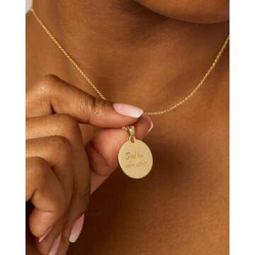 Show more Transform your style and inspire your spirit with the PAVOI 14K Yellow Gold Plated Engraved Hammered Coin Pendant Necklace. This unique piece features a stunning 19" adjustable slider chain and an exquisite hammered medallion that not only captures the eye but also carries a hidden message on its back: "Find the calm within." This special touch makes it more than just a necklace; it’s a personal treasure that reminds you to embrace your inner strength and tranquility every day.
