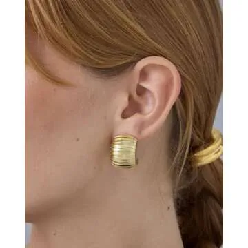Show more Introducing the PAVOI 14K Yellow Gold Plated Chunky Ribbed Hoop Earrings, expertly designed to enhance your jewelry collection with a perfect blend of modern elegance and timeless charm. Crafted with durable stainless steel posts and a beautiful textured finish, these earrings measure 25mm x 17mm, providing a chunky yet lightweight feel. The stunning gold plating not only makes a statement but also ensures these earrings complement any outfit, whether you're dressing up for a night out or keeping it casual for an everyday look.
