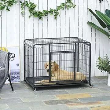 PawHut Heavy Duty Folding Design Metal Dog Cage Crate & Kennel with Removable Tray, 4 Locking Wheels, Indoor/Outdoor, 43"