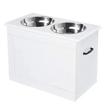 Show more Introducing the PawHut Raised Pet Feeding Storage Station, a meticulously crafted solution for pet owners who value both practicality and style in their feeding setups! This elevated dog feeder is designed not just to cater to the basic needs of your furry friend, but also to enhance the aesthetic of your home. Made from premium P2 grade MDF and featuring elegant wood panels in a chic white finish, it effortlessly blends with any interior decor. Standing at a comfortable height of 16.25 inches, it is perfect for large dog breeds, promoting healthier dining posture that reduces strain on their spine and joints.