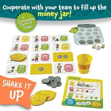 With each game, players roll dice to gather ingredients and create refreshing lemonade recipes to serve their customers. The objective is simple yet engaging, making it perfect for kids who may be starting to learn the rules of playing games. The game fosters an inclusive environment where everyone works together towards a common goal: filling the coin jar and celebrating successes together.