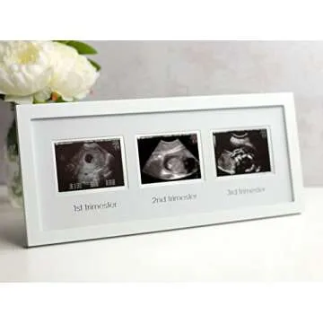 Show more Introducing the Pearhead Sonogram Progression Frame, an exquisite way to commemorate the incredible journey of pregnancy, trimester by trimester. This beautifully designed frame not only allows you to celebrate each stage of your pregnancy but also serves as a timeless keepsake for years to come. Crafted from high-quality materials, the frame features a sleek white finish that complements any nursery or home decor theme, making it a versatile addition to your cherished space. With dedicated slots for ultrasound pictures from the 1st, 2nd, and 3rd trimesters, it encourages you to capture those fleeting yet precious early moments in your baby's life.