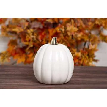 Show moreIntroducing the adorable ceramic pumpkin from Pearhead, the quintessential fall décor piece that seamlessly transitions from Thanksgiving dinner to Trick-or-Treat night! This charming white ceramic pumpkin features a stunning gold stem, adding a touch of warmth and elegance to your home. Its cozy appeal makes it a delightful decorative accessory that can enhance any room, be it your office, bedroom, living room, or kitchen.