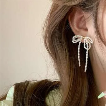 Pearl Bow Dangle Earrings Sterling Silver Post Adorable Charm Bowknot Faux White Pearl Beaded Chandelier Tassel Earrings for Women Wedding Birthday Valentine's Day Fashion Jewelry Gifts (Gold)