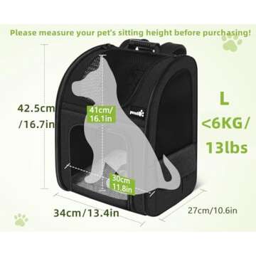 Show moreIntroducing the Pecute Cat Carrier Backpack, your ultimate companion for traveling with your beloved pets! Designed for comfort and convenience, this expandable backpack is perfect for small dogs and cats weighing up to 18 lbs. With dimensions meticulously crafted for a perfect fit, it ensures that your furry friends can accompany you on all your adventures. Choose from two sizes to accommodate pets with a sitting height of up to 17.6 inches. The L size (17.4" L x 13.4" W x 10.6" H) is perfect for cats under 15.4 lbs and small dogs under 13 lbs. The XL size (19.3" L x 15.7" W x 12.9" H) provides ample space for pets weighing between 15.4 to 24 lbs, accommodating their comfort while keeping them securely confined.