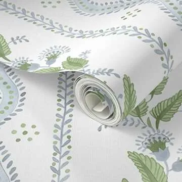 Show more Transform your space effortlessly with the stunning Peel & Stick Wallpaper from Spoonflower. This beautiful wallpaper features a gentle blend of soft blue, green, and white stripes adorned with elegant green floral dots. Ideal for renters, its removable design allows you to decorate without the commitment of traditional wallpaper. Whether you're revitalizing your living room, bedroom, or kitchen, this wallpaper provides a fresh yet timeless touch to any room. Measuring 2 feet by 12 feet, it's spacious enough for larger projects, while also being versatile for smaller accents.