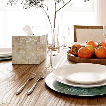 PEMAR 5.9” Cube Mother of Pearl Tissue Box Cover, Decorative Napkin Dispenser Organizer, Rustic Farmhouse Vintage Decor for Table, Kitchen, Bathroom Vanity Countertop, Office (White Sand)