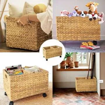 PEMAR Set 2 (different sizes nesting in a set) Natural Wicker Rolling Storage Baskets on Wheels w Insert Handle, Under Table Under Desk Storage Bins, Mobile File Cabinet Organiser. Water Hyacinth