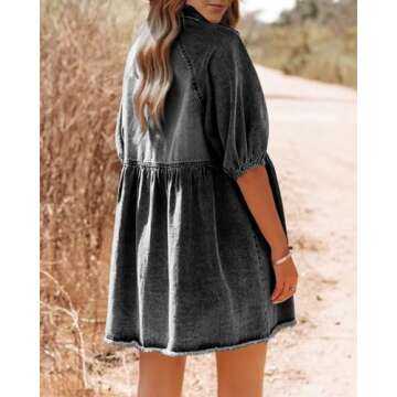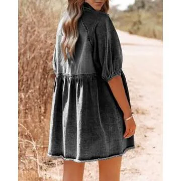 Pepochic Womens Summer Denim Dress Button Down Short Sleeve Babydoll Dress Puff Sleeve Flowy Jean Dress Black