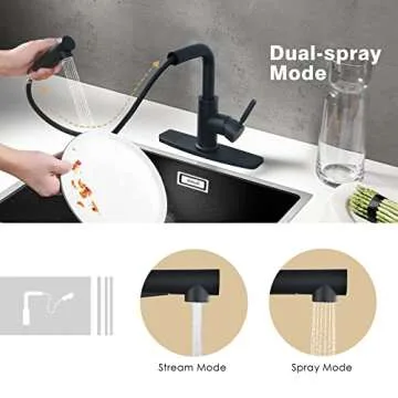 One of the standout features of this kitchen faucet is the easy-to-install pull-out spout, allowing you to reach every corner of your sink with ease, breaking the space limitations often encountered in kitchens. Installation is a breeze with pre-assembled components that can be completed in just 30 minutes by following our comprehensive product manual. This faucet has multi-layer matte black finish which not only resists peeling and discoloration but also helps avoid fingerprints and water stains, significantly reducing your cleaning time.