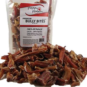 Show moreIntroducing **Peppy Pooch Bully Bites** – a delightful 1lb pack of all-natural beef treats that are not only irresistible to dogs but are also proudly made in the USA. These premium treats ooze quality, sourced from the finest ingredients and crafted with love to cater to the taste buds of every pooch, regardless of size. Expect superior craftsmanship with each bite ensuring that your furry friend gets the best of what nature has to offer! Elevate your dog's snack time with these delicious morsels that promise both taste and nutrition.
