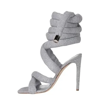 perixir Strappy High Heels Gladiator Sandals With Grey Jersey Knit Fallopian Cloth Rope Lace Up Sexy Open Toe Square Stilettos Tie Up Heeled Sandals For Women US Size 6