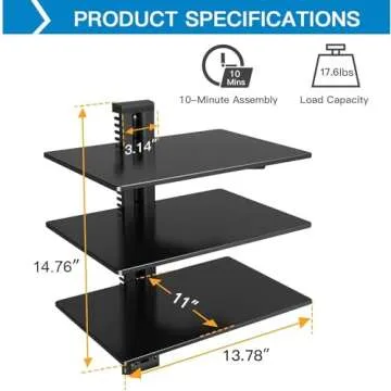 Show moreEnhance your entertainment space with the PERLESMITH Floating Wall Mounted Shelf. This innovative AV mount shelf is designed for maximum functionality and style, accommodating up to an impressive 17.6 lbs. Crafted from strengthened tempered glass, measuring 13.78 x 11 x 14.76 inches with a thickness of 4mm, this shelf is not only robust but also elegantly minimalist, seamlessly fitting into any decor. Whether you need a place for your DVD/Blu-Ray players, satellite/cable boxes, gaming consoles, or hi-fi surround sound speakers, this shelf provides a sturdy and attractive solution. With compatibility for both wood and concrete walls, installation is as easy as it gets thanks to the comprehensive instruction manual and included fittings.