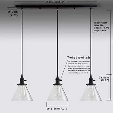 PERMO Vintage Rustic Industrial 3-Lights Kitchen Island Chandelier Triple 3 Heads Pendant Hanging Ceiling Lighting Fixture with Funnel Flared Clear Glass Shade (Black)