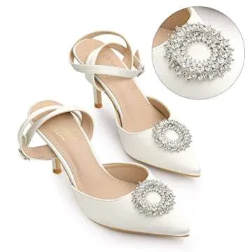 Show moreStep into elegance and sophistication with the Perphy Rhinestones Ankle Strap Stiletto Heel White Pumps. These stunning shoes are designed for the modern woman who wants to add a touch of glamour to her wardrobe, featuring a luxurious satin upper available in three chic colors: Black, White, and Royal Blue. The pointed toe and sleek slingback design create a flattering silhouette while the exquisite rhinestone decor adds just the right amount of sparkle, making these pumps a must-have for any fashionista. With a durable rubber sole and a comfortable 3.3'' heel height, these pumps not only exude style but also ensure your feet feel as great as they look. Whether you’re attending a wedding, date night, or a glamorous cocktail party, the Perphy heels promise to elevate your outfit and boost your confidence.