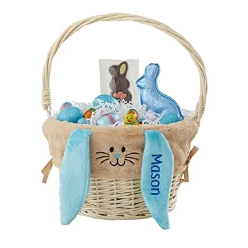 Show more Introducing the Personalization Universe Hand-Woven Easter Basket—an enchanting and stylish addition to any child's Easter celebrations. This unique basket features a stunning tan bunny liner that you can personalize by embroidering your child’s name on the bunny's ear, ensuring each basket is a one-of-a-kind treasure. Crafted with care, the natural wicker construction not only provides durability but also brings a delightful vintage charm to your festivities. Measuring around 17”-19” high and 12” in diameter, it is spacious enough to hold a plethora of Easter goodies, from colorful eggs to sweet treats, making it the perfect companion for your child's egg hunt adventures.