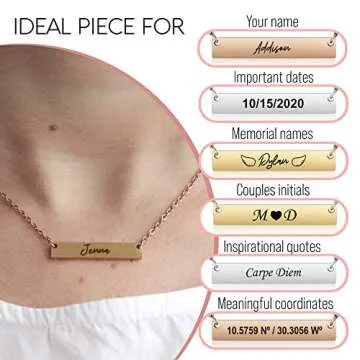 Show more Introducing our exquisite personalized bar necklace, a stunning accessory that transcends mere trends and becomes a cherished piece of jewelry. Crafted from top-quality stainless steel and elegantly plated in gold, rose gold, or silver, this necklace is designed to withstand the test of time—resisting rust, tarnishing, and corrosion. Its luxurious finish ensures that you radiate sophistication while wearing it.