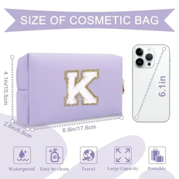 Show more Introducing the Personalized Makeup Bag with Initial A-Z! This stylish and unique cosmetic bag combines functionality with a fun, modern design that any girl would love to own. Crafted from high-quality waterproof PU leather, this bag not only features a gorgeous purple hue but also showcases a trendy, glittery chenille patch that displays the initial of your choice. Whether it’s your daughter, girlfriend, or best friend, this bag makes a fabulous personalized gift for anyone in your life. With its spacious interior, it effortlessly accommodates all your essential makeup and toiletries while adding a charming touch to your daily routine.