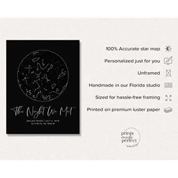 Designed with care, our constellation maps serve not just as decor but as meaningful reminders of cherished experiences. Whether it's a wedding day, birth of a child, or a special date, these maps are personalized to reflect your unique memories with a splash of artistry. Our brand, Prints Made Perfect, is dedicated to ensuring each piece is a masterpiece that stands the test of time.