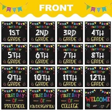 Show moreCapture the joy and nostalgia of your child's educational journey with the PETCEE First Day of School Sign. This charming set includes a total of 16 high-quality chalkboard-style signs, perfectly designed to commemorate the first and last days of Preschool, Kindergarten, and every grade up through College. Measuring a convenient 10" x 8", these signs are not just photo props; they are cherished keepsakes that allow you to record and celebrate each milestone in your child's academic life. Whether you’re snapping photos for social media or creating a scrapbook of their educational journey, these signs make it easy to preserve those special moments in style.