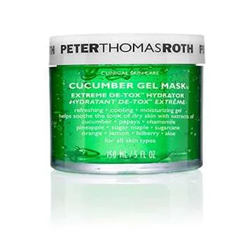 Show more Experience the soothing embrace of the Peter Thomas Roth Cucumber Gel Mask, a refreshing 150 milliliter / 5 fluid ounce gel that is expertly crafted to provide hydration, calming relief, and unparalleled comfort to dry, irritated skin. This ultra-gentle formula is a powerful blend of botanical extracts, including cucumber, papaya, chamomile, pineapple, sugar maple, sugarcane, orange, lemon, bilberry, and aloe, designed to soothe and rejuvenate skin affected by various annoyances. Its versatility allows it to be used not just for the face, but also under the eye area to help reduce puffiness.