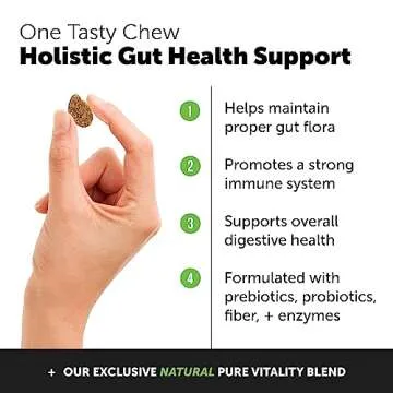 This unique formula combines probiotics, chicory root, and digestive enzymes to help balance gut flora and tackle digestive upsets. With around 70% of your dog's immune system residing in their gut, our chews work diligently to bolster their immune response as well. Furthermore, they provide relief for sensitive skin and help maintain a lustrous coat, giving you even more reasons to keep your beloved pet happy and healthy.