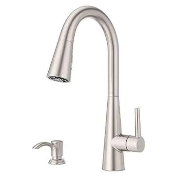 Show more The Pfister Barulli Kitchen Faucet is not just a functional fixture but a statement piece for your kitchen. With its advanced spray head docking system and elegant forward handle design, this faucet redefines ergonomic functionality. The pull-down sprayer offers unparalleled versatility, allowing you to switch effortlessly between spray and stream modes at your convenience. Say goodbye to cluttered countertops; included is a decorative deckplate and a coordinating soap dispenser that adds both utility and style.