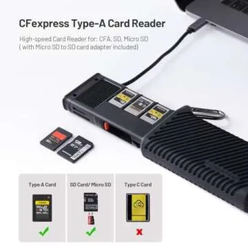 Built from durable aluminum alloy and accompanied by a silicone case for added protection against falls and shocks, the CreateMate fulfills both form and function. The design integrates a carabiner clip for easy attachment to bags or belts, ensuring you always have your cards handy. An additional built-in sealing ring offers dust and splash resistance, making this card reader an ideal choice for those who work in dynamic environments.