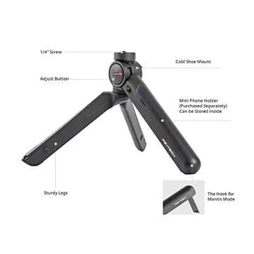A notable feature is the integrated mini smartphone holder, conveniently stored within the tripod leg for easy access. Additionally, the rotatable cold shoe on the side permits the attachment of accessories like lights or microphones, significantly enhancing your creative potential. Whether you’re capturing breathtaking landscapes or dynamic vlogs, the MantisPod 2.0 is versatile enough to fit every need.