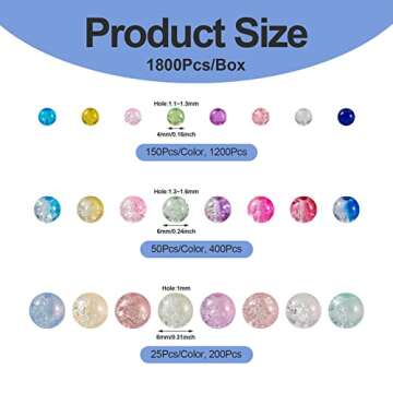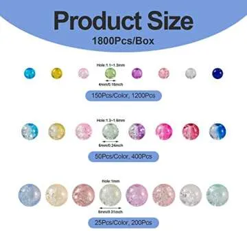 Show more Unleash your creativity with our exquisite assortment of Crackle Glass Round Beads. This fantastic kit includes a total of 1800pcs of beautiful beads in various sizes: 1200pcs of 4mm, 400pcs of 6mm, and 200pcs of 8mm. Perfectly crafted from high-quality glass, these beads are designed to withstand the test of time, showcasing a unique crackle effect that adds depth and interest to your jewelry designs.