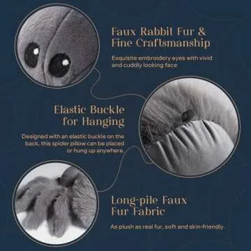 Show moreThe Phantoscope Spooky Fluffy Spider Pillow for Halloween is the ultimate addition to your Halloween decor, combining charm and a hint of whimsy! Crafted from high-quality faux rabbit fur, this adorable deep gray spider pillow is not just visually appealing but also incredibly soft to the touch. Measuring a cozy 9.5 x 16 inches, it's designed to become your go-to cuddle buddy on spooky nights, making it an irresistible companion for both children and adults. The pillow’s cuddly, innocent face adds fun to any gathering while ensuring it fits seamlessly into your everyday decor, bringing a playful touch to your room all year round.
