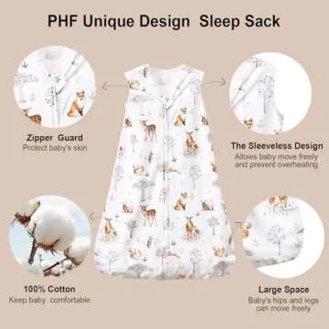 PHF 100% Cotton Baby Sleep Sack, 2-Way Zipper Baby Wearable Blanket, 6-12 Months TOG 0.5 Toddler Sleeping Sack, 2 Pack Sleeveless Soft Sleeping Bags for Baby Boys Girls, Medium, Woodland
