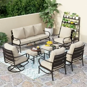 Show moreTransform your outdoor space into a tranquil oasis with the PHI VILLA 7 Piece Patio Conversation Set. This exquisite furniture collection is not just about looks; it's a comprehensive ensemble featuring a luxurious 3-seater deep seating bench sofa, two elegant swivel chairs, two single padded cushion chairs, and two versatile ottomans. Each piece is thoughtfully designed to merge functionality with elegance, making it the quintessential addition to any garden, balcony, or lawn.