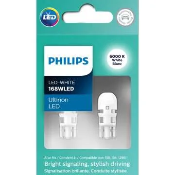 Show moreElevate your vehicle's lighting with the Philips Automotive Lighting 168WLED Ultinon LED bulbs, now available in a sleek 2-pack. Designed to deliver cutting-edge style and exceptional performance, these LED lights emit a stunning 6000K bright white light that not only enhances the appearance of your car but also improves road safety. Forget about dim, ineffective stock bulbs; Philips Ultinon LEDs provide excellent light distribution, making them perfect for backup lights, turn signals, and brake lights. Installation is a breeze with these direct replacements for conventional bulbs, allowing you to upgrade your ride effortlessly.