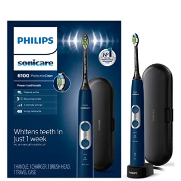 Show moreTransform your oral care routine with the **Philips Sonicare ProtectiveClean 6100 Rechargeable Electric Toothbrush**. Engineered for superior gum health and effective plaque removal, this toothbrush is your key to a radiant smile. With its advanced sonic technology producing up to **62,000 brush movements per minute**, you can experience a level of clean that is truly exceptional, as it gently sweeps away plaque while promoting healthier gums. The sleek navy blue design adds a touch of elegance to your bathroom, making this toothbrush not only effective but also stylish.