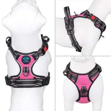 Show more The PHOEPET No Pull Dog Harness is an innovative and stylish solution for dog owners seeking comfort and control during walks. This upgraded version features an easy-on, easy-off design with three buckle closures—two on the chest and one lockable on the neck—eliminating the hassle of going over your dog's head. Your furry companion will not just wear it; they'll love wearing it!