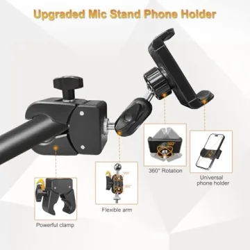 Show moreIntroducing the ultimate solution for musicians, fitness enthusiasts, and busy parents alike: the Phone Holder for Mic Stand. This upgraded clamp mount is not just your ordinary phone holder; it represents innovation, stability, and versatility. It’s expertly designed to provide a secure grip for your smartphone while enhancing your performance or activity, whether you’re on stage, working out, or simply keeping your hands free while pushing a stroller. With an adjustable clamping jaw capable of fitting a wide variety of poles from 0.47 to 1.1 inches in diameter, this holder easily attaches to microphone stands, desk pipes, gym equipment like treadmills or spin bikes, and even strollers, accommodating your dynamic lifestyle with remarkable ease.