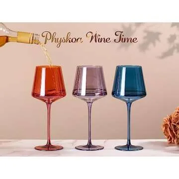 Show more Elevate your drinking experience with the Physkoa Colored Wine Glasses Set of 6. These modern, colorful wine glasses are designed to add a vibrant touch to any occasion, combining functionality with a stylish twist. Crafted with durable glass, each glass features a tall long stem and a flat bottom, ensuring stability while enhancing the elegant presentation of your favorite vintages. With a generous capacity of 14oz, they are perfect for serving both red and white wines. The assorted colors bring a lively flair to your glassware collection, making every sip a celebration!