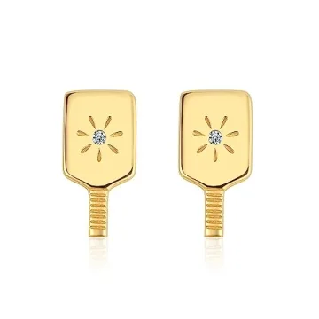 Show more Introducing the delightful Picklebelle Pickleball Paddle Stud Earrings, an exquisite piece of jewelry designed specifically for pickleball lovers. These earrings are crafted with premium 18K gold plating over sterling silver, ensuring durability and a long-lasting shine that will withstand the rigors of daily wear, both on and off the pickleball court. Their unique design captures the essence of the sport, showcasing visually accurate pickleball paddles with an eye-catching starburst impact—just as if you had hit that perfect shot!