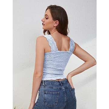 PICPUNMAK Women Square Neck Crop Tank Top Wide Strap Floral Fringe Lettuce Edge Crop Vest Sleeveless Crop Tops Tanks Cami Baby Blue