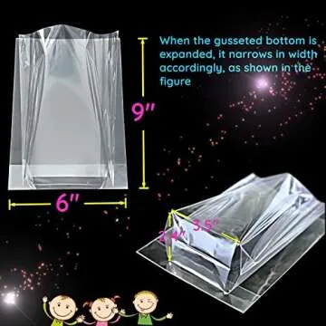 PigPotParty 6"x 9", 100Pcs Bottom Gusset Bags, Clear Plastic Cellophane Treat Goodie Bags with Ties for Party Favor, Candy, Cookie, Popcorn, Small Gift Wrapping (No Side Gusset)