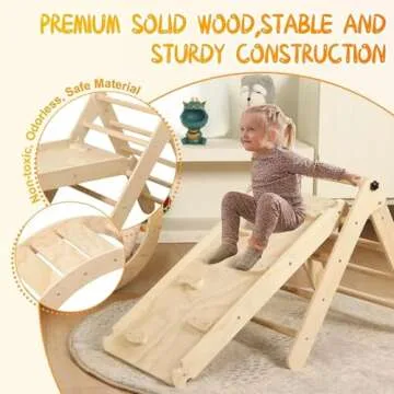 Show more Introducing the ultimate playtime companion for your little one: the Pikler Triangle Set with Cushion. This thoughtfully designed climbing gym is ideal for toddlers aged 1-3 years, promoting a playful learning environment. Crafted from sturdy natural wood and finished with a non-toxic varnish, it not only prioritizes safety but also graces your home with an elegant, neutral aesthetic. The rounded edges and smooth finish ensure that parents can relax while their toddlers explore, and its solid construction minimizes any risk of tipping, allowing for adventurous play without worry.