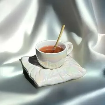 Pillow Talk Coffee or Tea Cup & Saucer Set, Quality Ceramic, White Pearl Iridescent Mug, Gold Spoon Included