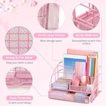 Pink Desk Organizers and Accessories, Pink Office Supplies with Mesh Desk Organizer, Acrylic Tape Dispenser and Stapler, Staples, Ballpoint Pen, Clips Set, Ruler, Scissor, Sticky Labels