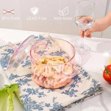 Show more Introducing the perfect kitchen companion for culinary enthusiasts – our exquisite glass cooking pot set! This stunning 1.5-liter pot is crafted from high borosilicate glass, ensuring exceptional durability and heat resistance. The set includes a charming pink glass ladle, a heart-shaped metal hook for easy storage, and a sponge for effortless cleaning, making it an essential addition to any kitchen. With a heat tolerance ranging from 0-400 degrees Fahrenheit, this pot is suitable for various cooking methods, whether on a gas or electric stovetop, in the oven, or even in the freezer.