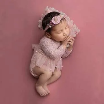 Pink Lace Infant Girl Photography Outfit - Pearl Lace Romper and Headband for Newborn Photoshoots (Long Sleeve, 0-2 Months)