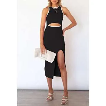 Pink Queen Cutout Dresses for Women Sexy Sleeveless Knee Length Cocktail Bodycon Ribbed Midi Dress Black XS