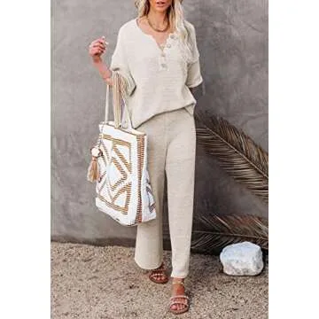 Show more Introducing the ultimate comfort and style solution for women, the Women 2 Piece Knit Sweater Outfit Set. This fabulous ensemble features a pullover top adorned with a button V-neck design, complete with a stylish side slit that allows for versatility, as it can also be worn off the shoulder. The batwing short sleeves give this outfit a trendy, oversized feel that not only looks chic but also provides ample room for movement.