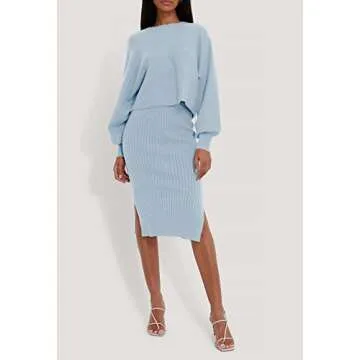 Pink Queen Women's 2 Piece Outfit Set Crop Sweater Top High Waist Ribbed Knit Slit Midi Party Skirt Dress Light Blue L